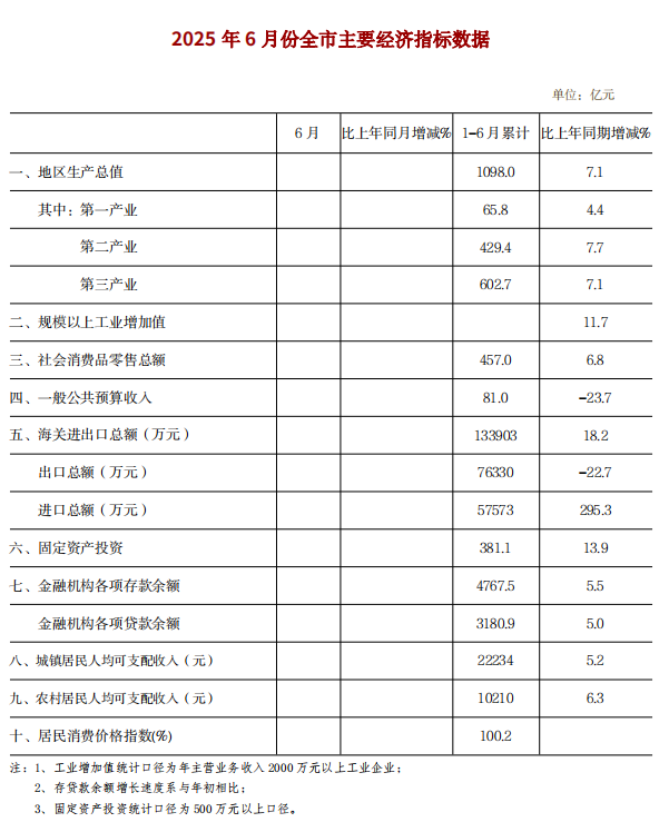 2025年6月份全市主要经济指标数据